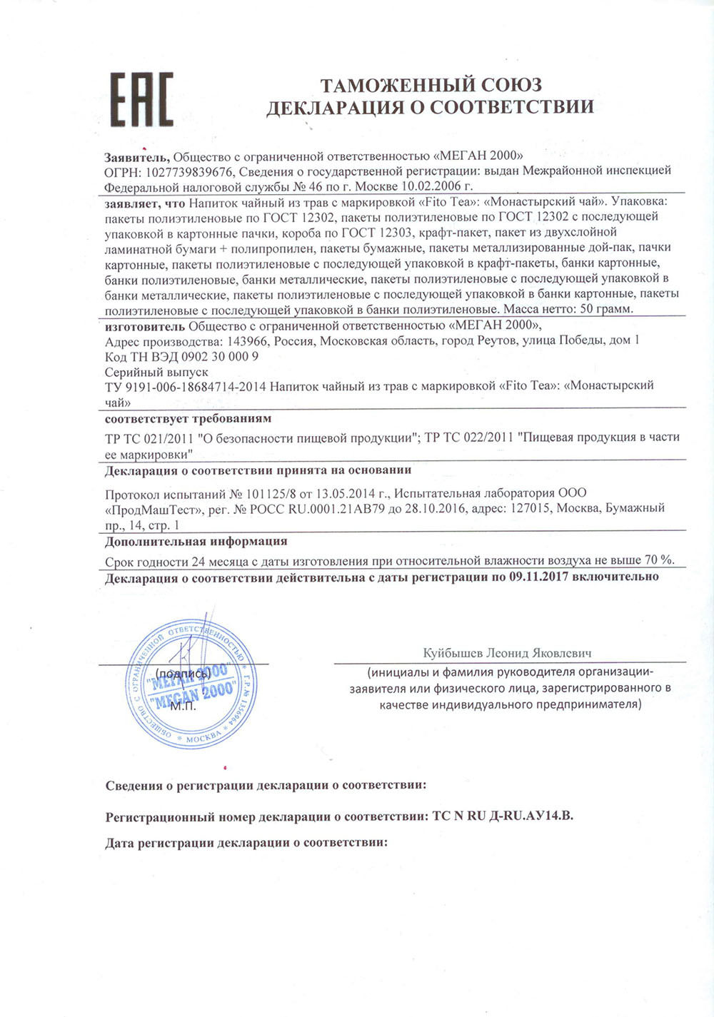 Сертификат соответствия на Монастырский чай