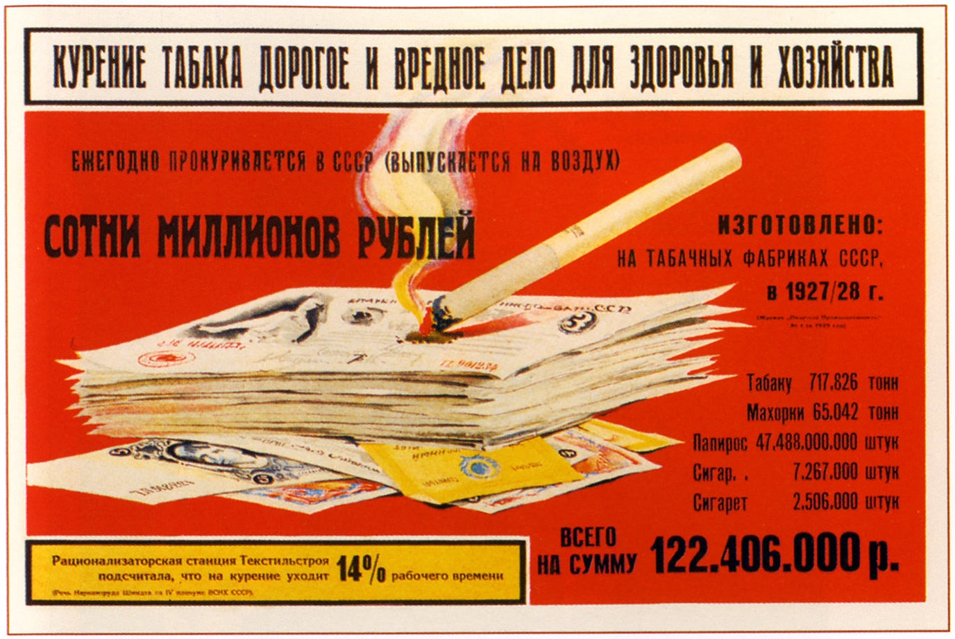 Рационализаторская станция Текстильстроя подсчитала, что на курение уходит 14% рабоче времени. Ежегодно прокуривается в СССР(выпускается на воздух) сотни миллионов рублей. Изготовлено на табачных фабриках СССР в 1927/28г: