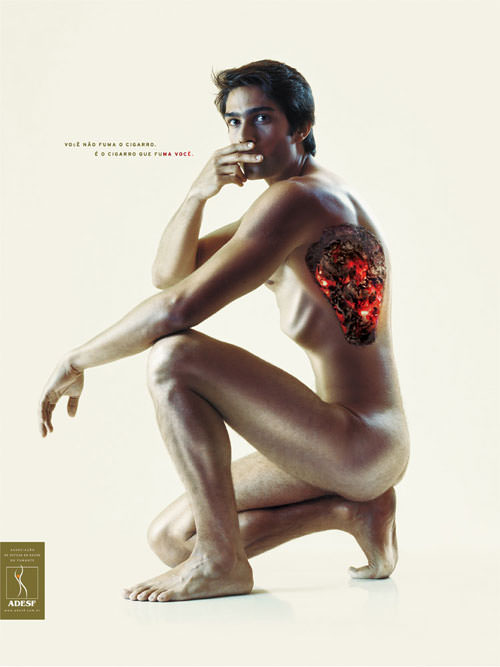 В данном случае речь пойдет о двух принтах, на которых обнаженный молодой человек и обнаженная юная девушка стоят в позе «кто спер сигарету?», а их легкие выглядят как вулканическая лава. «Раскаленные» легкие должны ассоциироваться у курильщика с тлеющим концом сигареты. Слоган: «Не ты куришь сигарету, сигарета курит тебя».