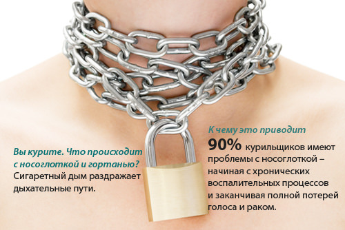 К чему это приводит. 90% курильщиков имеют проблемы с носоглоткой — начиная с хронических воспалительных процессов и заканчивая полной потерей голоса и раком.