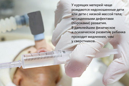 У курящих матерей чаще рождаются недоношенные дети или дети с низкой массой тела; врожденными дефектами(пороками) развития. В дальнейшем физическое и психическое развитие ребенка проходит медленнее, чем у сверстников.