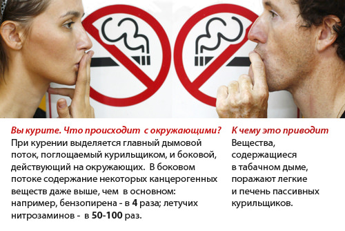 Вы курите. Что происходит с окружающими? При курении выделяется главный дымовой поток, поглощаемый курильщиком, и боковой, действующий на окружающих. В боковом потоке содержание некоторых канцерогенных веществ даже выше, чем в основном: например, бензопирена — в 4 раза; летучих нитрозаминов — в 50-100 раз.
