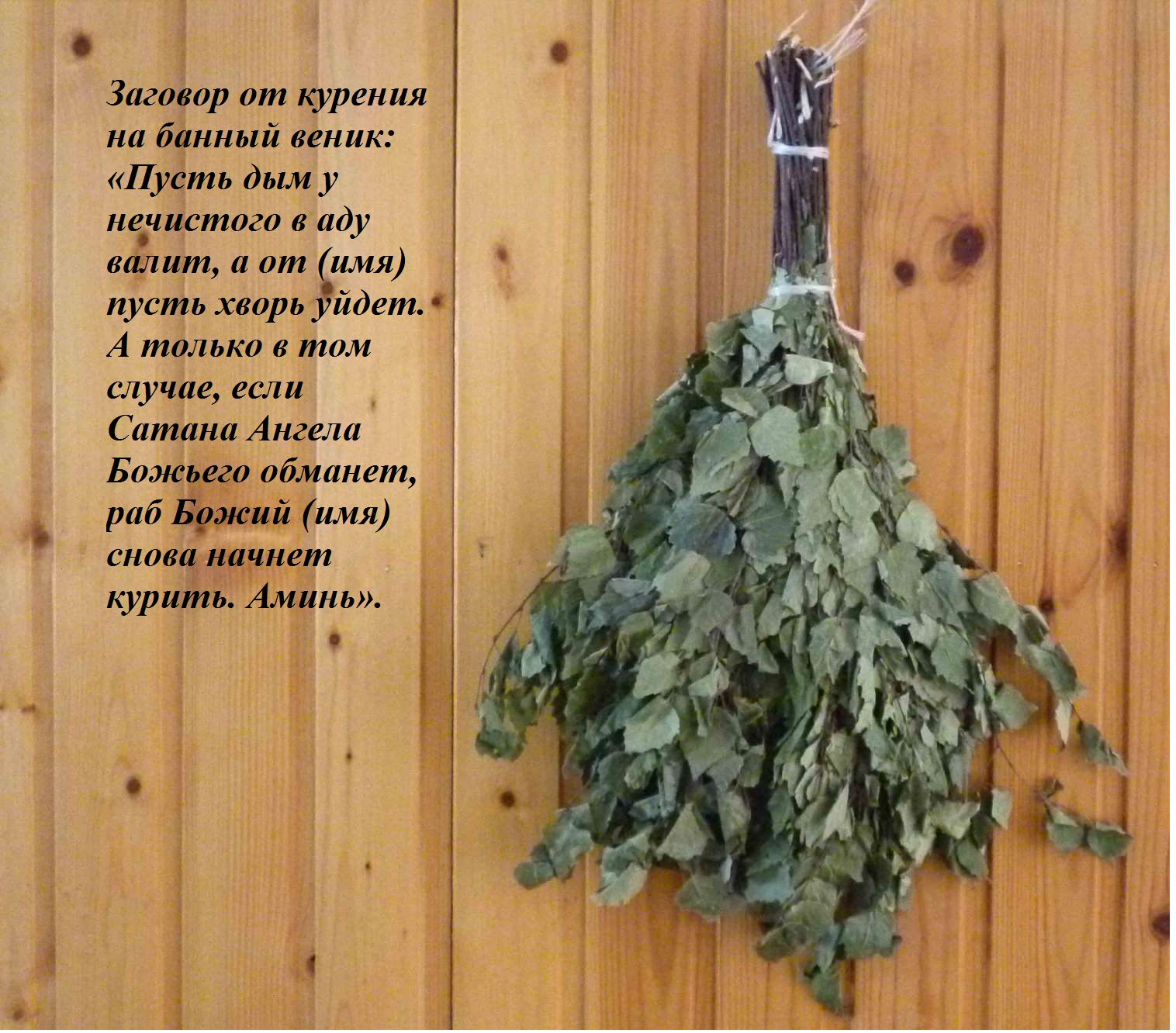 Мой муж курильщик со стажем 20 лет. Больно смотреть, как близкий человек на протяжении всех этих лет травит себя ядом, выкуривая по 2 пачки в день. Предложила мужу прочитать заговор на банный веник – благо живем в доме, баня есть и условия для проведения обряда. Результат появился спустя 3 недели. Правда, курить муж не бросил, но значительно сократил количество выкуренных сигарет в день. В следующем месяце планируем повторить обряд.