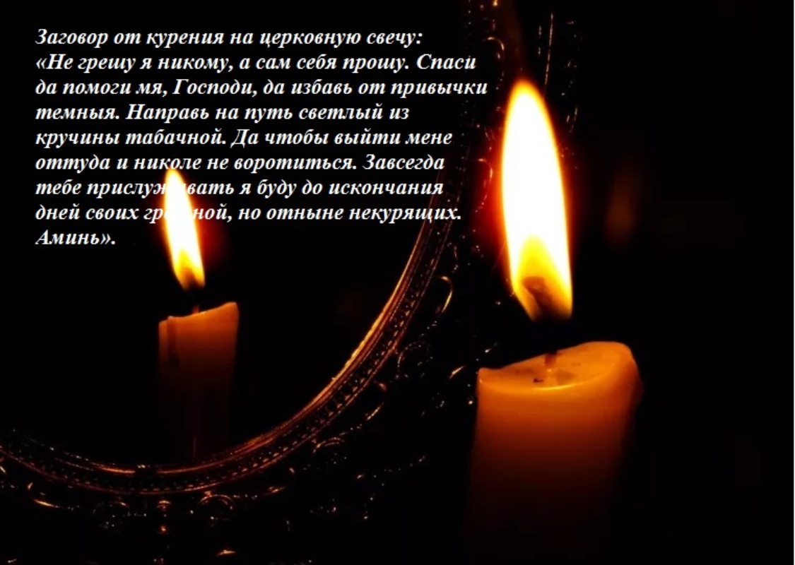 Для его проведения курильщику необходимо утром отправиться в храм и купить там 3 церковные свечи. Вечером после заката солнца свечи необходимо расставить перед зеркалом и зажечь их. Читать слова наговора следует, вглядываясь в собственное отражение.