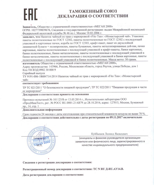 Сертификат соответствия на Монастырский чай