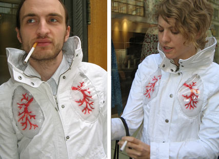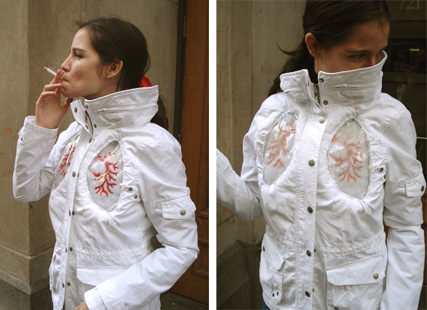 Нет! Никакого насилия над личностью курильщика. Просто спереди на груди куртки расположены карманы, имеющие вид человеческих лёгких. А в воротнике куртки имеется отверстие с клапаном, куда можно выдохнуть сигаретный дым. Длительное ношение такой куртки продемонстрирует изменения, которые происходят с лёгкими при курении.