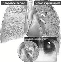 У курильщиков с 20-тилетним стажем риск развития рака лёгкого на 60-70% выше, чем у некурящих. У 85% пациентов с раком лёгкого – заядлые курильщики. На формирование опухоли в лёгких оказывает влияние стаж курения, количество выкуриваемых сигарет и концентрация никотина и смол в сигаретном дыме. Симптомы рака лёгкого: одышка, мучительный кашель, кровохаркание, боль в груди, часто повторяющиеся пневмонии.