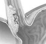 Сигаретный дым – постоянный раздражитель для клеток слизистой пищевода. Длительное курение приводит к возникновению злокачественной опухоли в этом органе. Симптомы рака пищевода: затруднение при глотании твёрдой пищи, боль и дискомфорт в загрудинной области. Если опухоль полностью перекрывает просвет органа, то без медицинского вмешательства человек обречён на мучительную, голодную смерть.