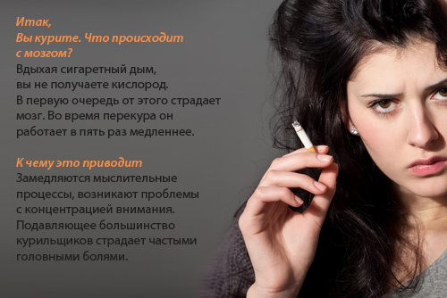 Итак, вы курите. Что происходит с мозгом? Вдыхая сигаретный дым, вы не получаете кислород. В первую очередь от этого страдает мозг. Во время перекура он работает в пять раз медленнее.